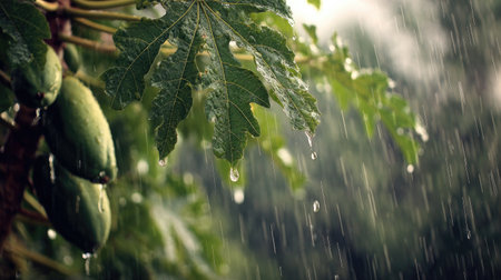 Soft rain falling gently on Papaya tree, with water droplets forming and slowly dripping. The background is softly blurred with a natural, moody atmosphere.