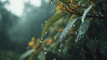 Soft rain falling gently on leaves, with water droplets forming and slowly dripping. The background is softly blurred with a natural, moody atmosphere.