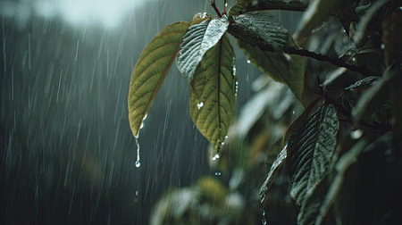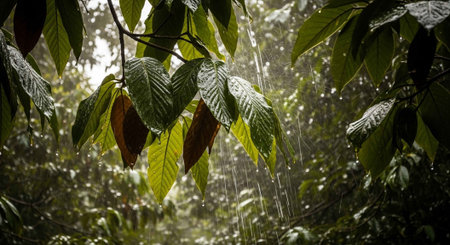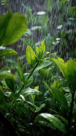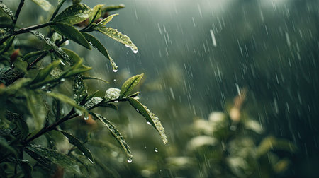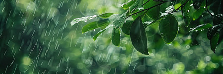 Lush green leaves are glistening with raindrops during a gentle rainfall creating a tranquil and natural scene that's perfect for illustrating nature or promoting relaxation.