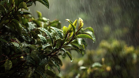 Camellia sinensis in a storm, heavy rain pouring down, strong winds twisting their leaves