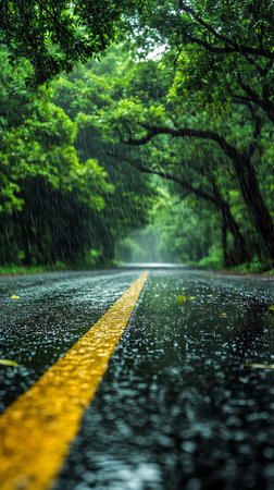 Atmospheric low-angle shot of a road vanishing into a verdant forest. Heavy rainfall creates a dramatic mood. A prominent yellow line runs across the rain-slicked asphalt.