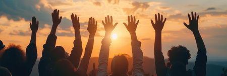 Group of people hands raised up in the air with sunlight background.