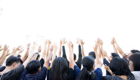 Hands Up: Group of people lifting hands isolated white background