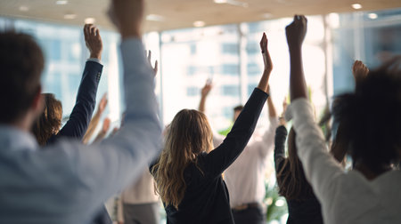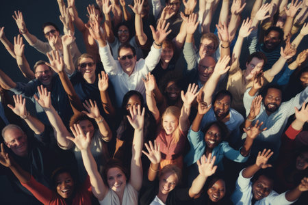 Multiethnic group of people raising their hands in a conference room, above view of diverse group of people raising hands together, waving, AI Generated