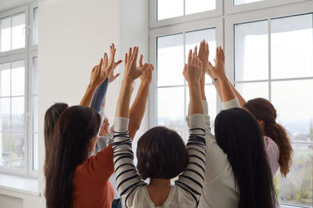 Rear view of female persons attending group therapy. Cropped image of group of happy women standing together in circle with arms raised. Concept of training for women, motivation and female friendship