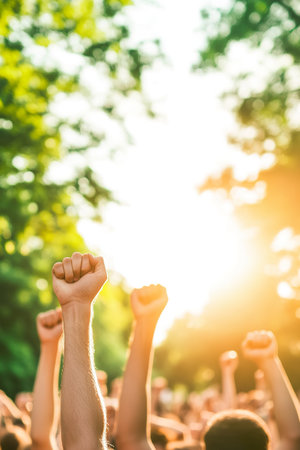 Raised Fists of Protesters Against Bright Sky and Blurred Green Trees.