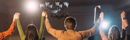 panoramic shot of actors and actresses with hands up and dramatic lighting