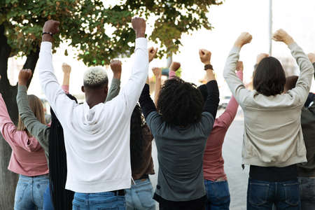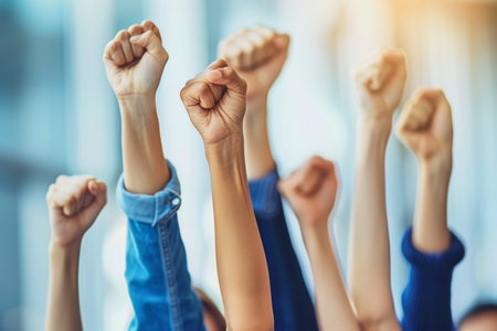 Group of hands raised in a protest, representing civil rights and social movements with unity and strength