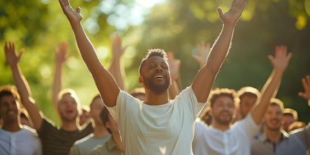 Group of men worshiping together outdoors with raised arms. Concept Brotherhood, Worship, Outdoors, Unity, Spirituality