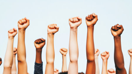 Many hands and arms of different ethnicities are rising up in the air, making fists as a sign of protest, strength, and unity against a clear blue sky