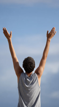 Young athlete is raising his arms to the sky, expressing a sense of freedom and wellbeing, enjoying the sunlight and the fresh air, maybe after a workout session