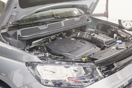 Engine compartment with open hood close-up, new car with new parts.