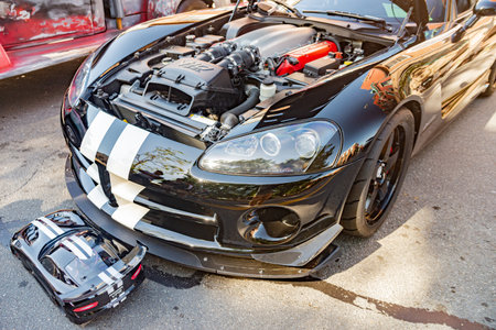 Dodge Viper sports car. open hood Dodge Viper sports car.