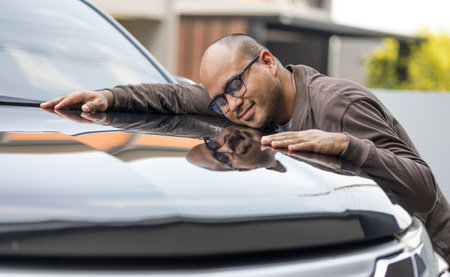 Young handsome asian man getting the new car. He hugged his car and was very happy. Buy or rent car concept.