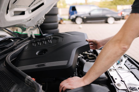 Hands of a skilled auto mechanic adjust components in a car engine ensuring everything runs smoothly while engaged in routine maintenance tasks.