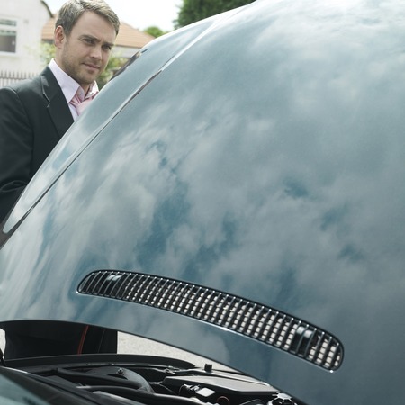 Businessman with an opened car hood