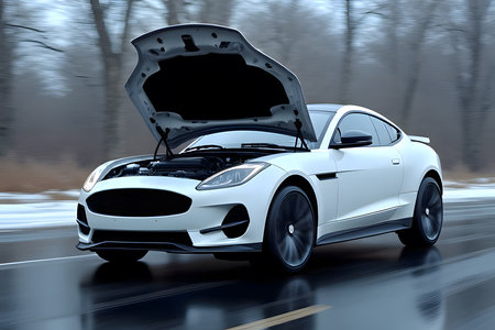 White car open hood ,Indicates the abnormality of the engine or for cooling from use