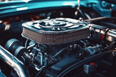 Close up view of american muscle car engine bay with chrome air filter and polished components
