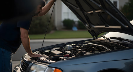A man looks under the open hood of a grey sedan parked in a suburban driveway. He appears to be inspecting the engine, checking for maintenance issues or performing a routine check-up.