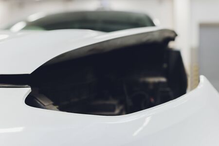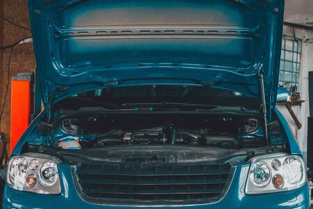 Car open hood in vehicle repair shop for maintenance service by mechanic,sunlight on background.