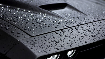 Close-up view of water droplets on a sleek black car hood, showcasing the glossy surface and intricate details, reflecting light and creating a striking visual.