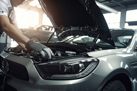 mechanics repairing a modern car in a modern workshop, close up, selective focus. Generative AI