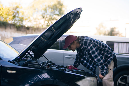 Automobile checkup conducted, Car battery inspected in neighborhood