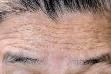 Close-up of a man forehead showing pronounced wrinkles, illustrating aging signs and relevance to cosmetic and skincare treatment.