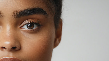 Close up portrait of a young woman showcasing flawless skin and expressive brown eyes, emphasizing beauty, confidence, and natural elegance
