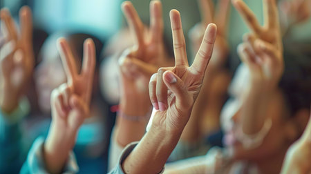 Close up of group of people raising hands with peace sign in classroom