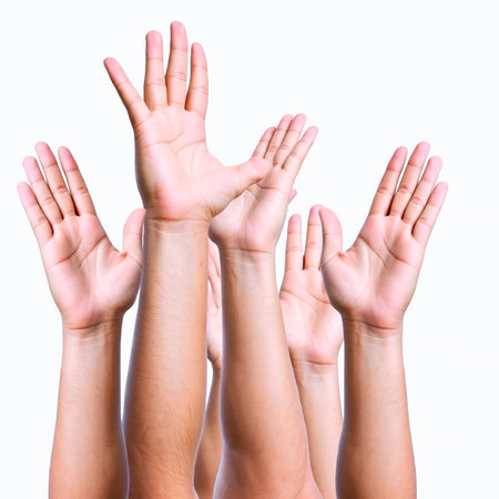 Five raising hands participation with isolated white background and copyspace.