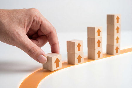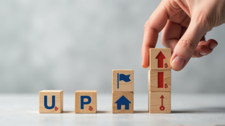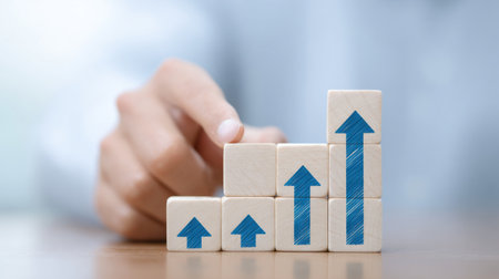 A human hand arranges wooden blocks with arrow signs into ascending steps on a glowing orange path to demonstrate concepts of economic growth and strategic development.