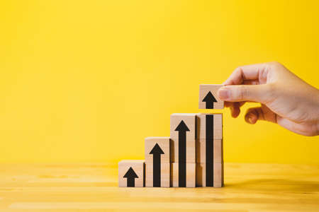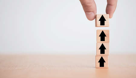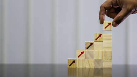 Hand arranging wood block stacking as step stair with arrow up. Ladder career path concept for business growth success process