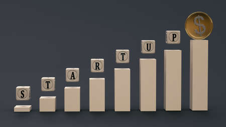 Cubes with the inscription Startup and a gilded coin with a dollar symbol stand on the ascending bars of the graph. The concept of success. 3D rendering. Layout. Copy space