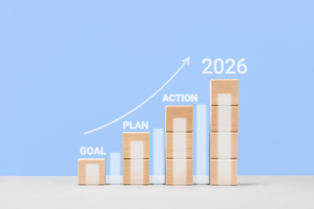 Plan, goal and action to achieve success in 2026. Wooden blocks in form of graphical steps up of business growth process, sustainable financial plan. Business growth success achievement concept.