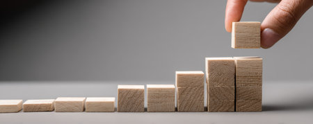 Wooden block staircase with hand placing top block symbolizing growth and progress in business and success