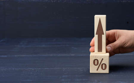 female hand holds a wooden block with an upward arrow and a cube with percent. Concept of increasing profit growth, increasing bank interest on deposits, blue background, copy space