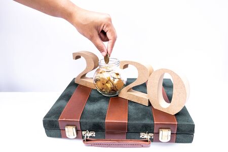 Hand putting coin into glass piggy bank with 2020 character, set business goals with New Year 2020.