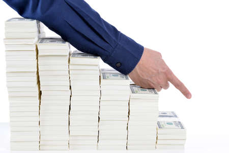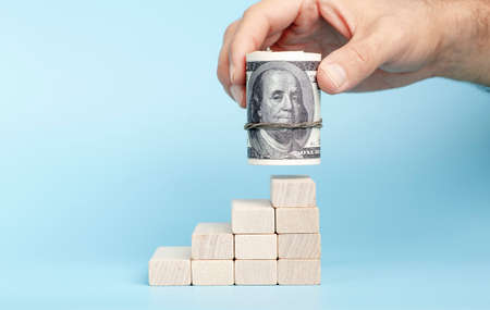 Dollars in hand on a on economic growth on a blue background. International currency and money of the USA. Investment, income, capital, banking, profit and business concept. high quality photo