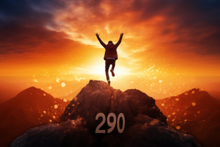 A Thrilling Start: Adventurous Men Leap Over Silhouette Mountains Welcoming Happy New Year 2019