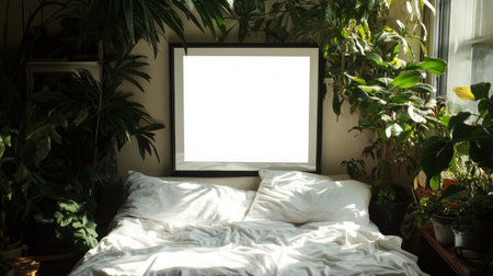 Photo of a large blank frame on the wall above an elegant white sofa, with plants and natural light creating a cozy home atmosphere. Web banner with copy space for text. --chaos 30 --ar 16:9 --v 6.1 Job ID: 54f39fc8-3e1e-4f4f-951b-ff603efa8bf9