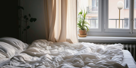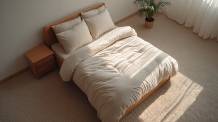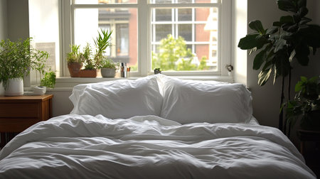 A tranquil bedroom scene bathed in soft natural light, featuring elegant bedding and a lush indoor plant, creating a cozy and inviting atmosphere for relaxation.