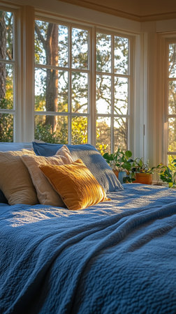 Soft blue bedding is arranged on a bed surrounded by vibrant plants. Warm sunlight streams in through large windows, creating a serene atmosphere filled with life.