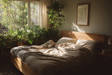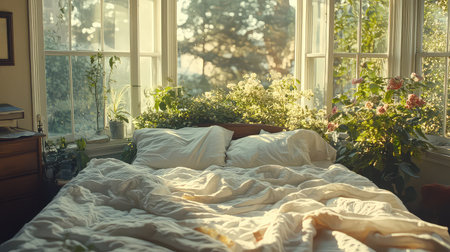 A bright and inviting bedroom filled with natural light, showcasing lush greenery and a messy bed, creating a serene and cozy atmosphere perfect for relaxation.