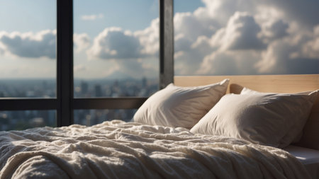 AI Generated. Bed Covered in White Fluffy Clouds Next to Window