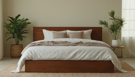 Modern bedroom interior featuring a comfortable bed, decorative pillows, bedside tables, and green houseplants