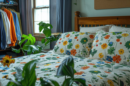 Cozy bedroom with floral bedspread in natural light. That the image is generated using AI.