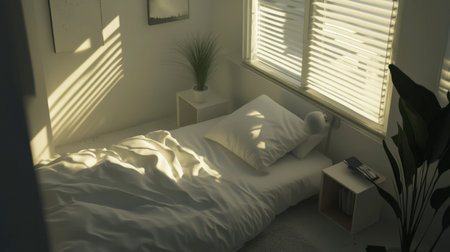 Warm sunlight gently fills a tranquil bedroom, creating soft shadows on luxurious white lines and inviting a peaceful start to the day.