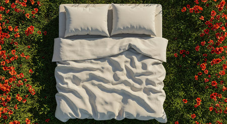 A serene top-down view captures a comfortable bed with soft white linens nestled amidst a field of blooming red flowers and fresh green grass, bathed in warm daylight.