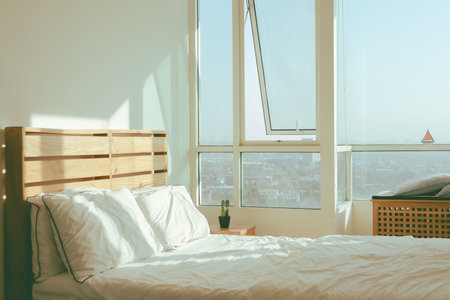 A serene bedroom scene featuring a soft bed near a large window, allowing natural light to illuminate the space, creating a warm and inviting atmosphere perfect for relaxation.